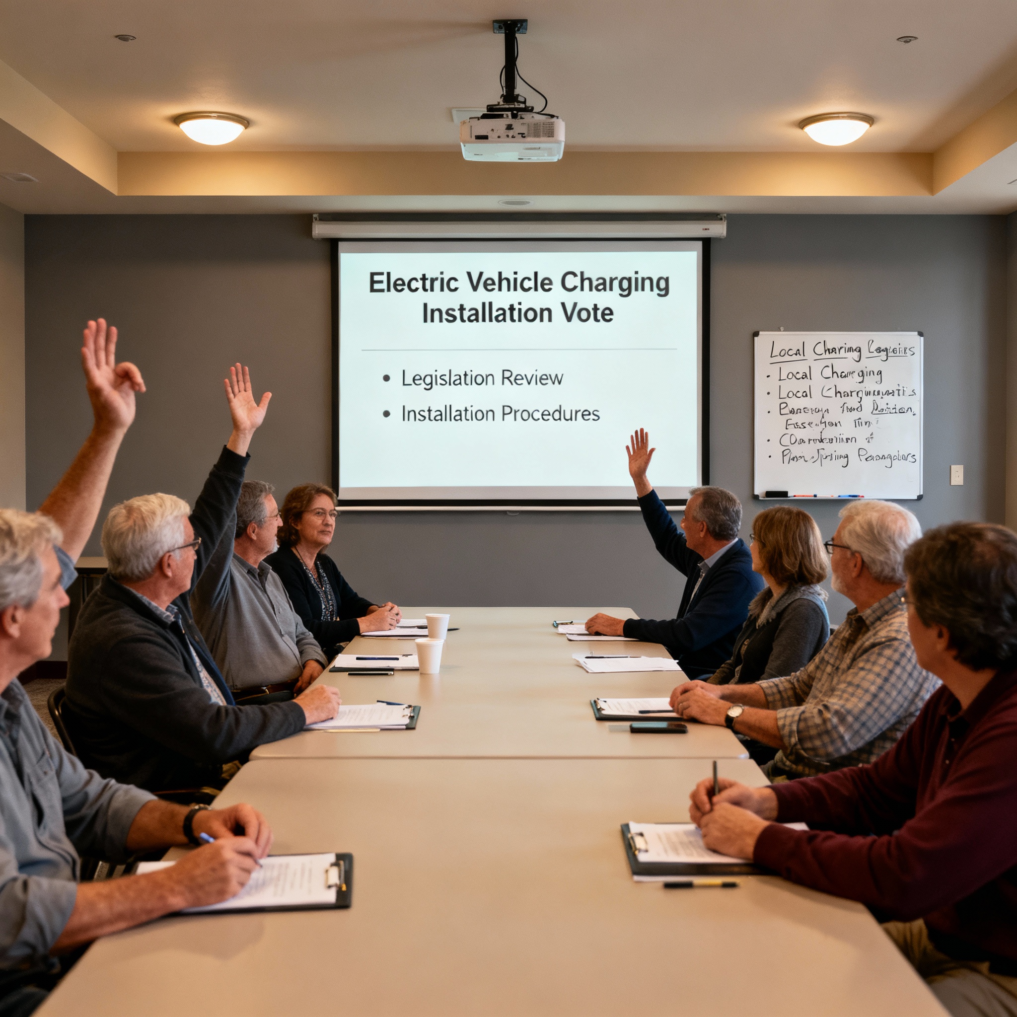 Assembleia condominial discutindo aprovação de pontos de recarga para carros elétricos